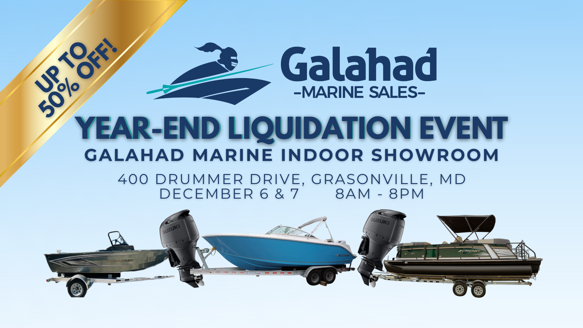 Join us December 6 & 7 from 8 AM to 8 PM at our all-new Indoor Showroom at 400 Drummer Drive in Grasonville, MD for our biggest Liquidation Sale of the year. As we move into our new space, everything must go to make room for incoming 2026 inventory. Enjoy up to 50% off select in-stock Starcraft and Sailfish models, including deck boats, pontoons, and fishing boats. Take advantage of free winter storage, priority spring pickup, and a nationwide sale with virtual tours available for out-of-area buyers. Plus, take up to $3,000 Off Suzuki Repower packages on select engines.